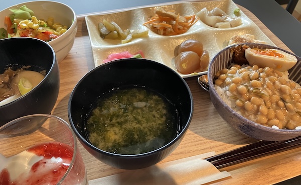 でも大丈夫だった、完食できた、自分にちょうど良い量でした。一番気に入ったのは「塩納豆」。納豆を塩漬けにして発酵させた酒田の郷土料理だそう。麹のやさしい香りが納豆くささをほんのり抑え、ほどよい塩気でごはんが進む。ああ、おかわりしたかった、できることなら。煮卵との相性も抜群でした♡