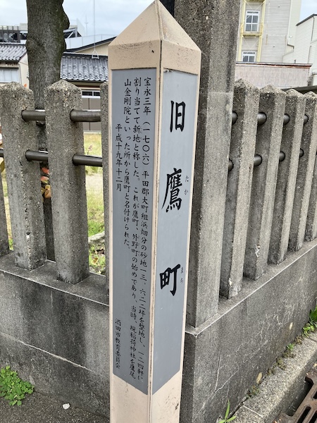 「宝永三年(一七〇六)平田郡大町組浜畑分の砂地一三,六二二坪を整地し、一二四軒に割り当てて新地とした。これが鷹町、外野町の始めであり、当時、現稲荷神社を鷹尾山金剛院といった所から鷹町と名付けられた。平成十九年十二月 酒田市教育委員会」