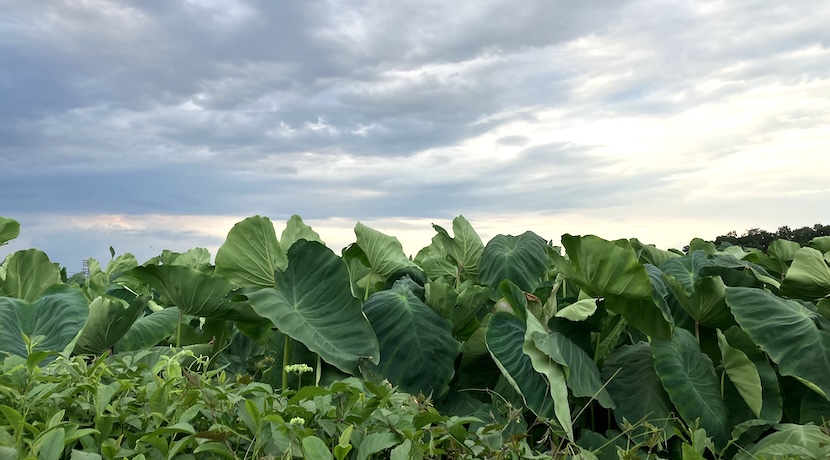 父母のいる施設のすぐ近くの畑の里芋は、大きくて元気そう。